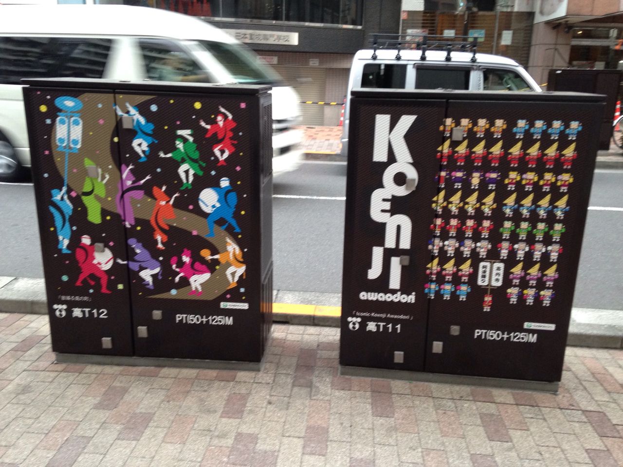 そんな高円寺の床屋(1,500円床屋)に行ったら、街中のポールとか東電のトランスボックスとかに阿波踊りを発見しましたよ!