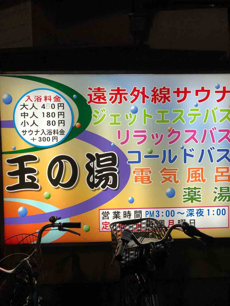 本日、玉の湯の鮮やかな看板に注視したところ「コールドバス」という文字を発見。